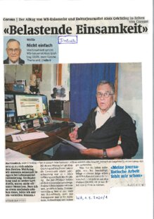 Stichwörter Brig-Glis, WB-Kolumnist, Kulturjournalist, Corona-Zeit, Alltag, Zweiter-Weltkrieg, Erinnerungen, Jahrzehntelang, Schreibbuch, Fotoapparat, Walliser-Dialekt, Kulturleben, Still-Legung, Aktionsradius, ETH-Elektroingenieurs, Volkswirtschaftler, Kollegiumslehrer, Hochrisikoperson, Hausbetreten-Verboten, Krankheitsspuren, Wohlfühlen, Gefangener, Sohn, Schwiegertochter, Schwestern, Einsamkeit, Kontakte, Spaziergang, Quartierweg, Garten, Fotografieren, Naturbeobachtung, Berge, La-Poste, Arbeiten-Wegfall, Bilanz, Hausarbeiten, SMZ-Dienst, Einkäufe, Unterstützung, Heimarbeit, Beschäftigung, Archivierung, Dokumente, Fotos, Homepage, Walliser-Wörterbuch-Zwei, Online, Lesestoff, Buch, Titel, Zeitschriften, Physik, Astronomie, Gedichte, Blick-Zukunft, Angst, Coronavirus, Gefahr, Schutz, Normalisierung, Vorfreude, Erinnerungen, Urgrossmutter, Spanische-Grippe