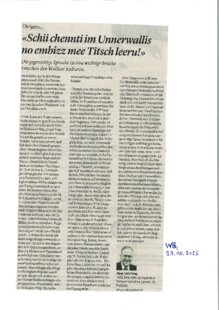 Stichwörter Ingenbohl, Kindergärtnerin, Pro Senectute, Politik, Verfassungsrat, Tschugger, Chrischschingli, Chrischschindli, Schpinnuwupp, Spinnenetz, Wallissertitsch, Walliser Deutsch, Walliserdeutsch, Iischi Schpraach, Dattilpalma, Dattelpalme, Oliwuböüm, Olivenbaum, Schaafwolla, Schafwolle, Bethlehem, Schpinna, Aarflätta, Armvoll, Aarum, Arm, ämbri, hinab, Cläck, Ritze, derzüe, dazu, eso, so, eswaa, irgendwo, gad, gerade, graamu, kriechen, gschliffu, geschlüpft, gschrinru, schreinern, händ, haben, Hänne, Hühner, irusch, ihre, Lädi, Brett, Lädinihoblu, Bretterhobeln, länge, ausreichend sein, Mämmi, Kleinkind, Säugling, mitsch, inmitten, mu, man, nere, einer, Poort, Türe, Ägyptu, Ägypten, Schtallbäsmu, Stallbesen, suscht, sonst, teiff, tief, uriewig, unruhig, üsa, heraus, üsgerächnut, genau, ausgerechnet, üsschpreitu, ausbreiten, vircha, heraus, Wasserchrieg, Wasserkrüge, Dechchi, Decke, wetgangsch, weidgangsch, Brügg, Pflanze, fädmu, Fäden setzen, Letzi, Verwundung, Schaden, wersweisu, zwiiflu,, zärbooju, Achchermätzi, Vogelscheuche,