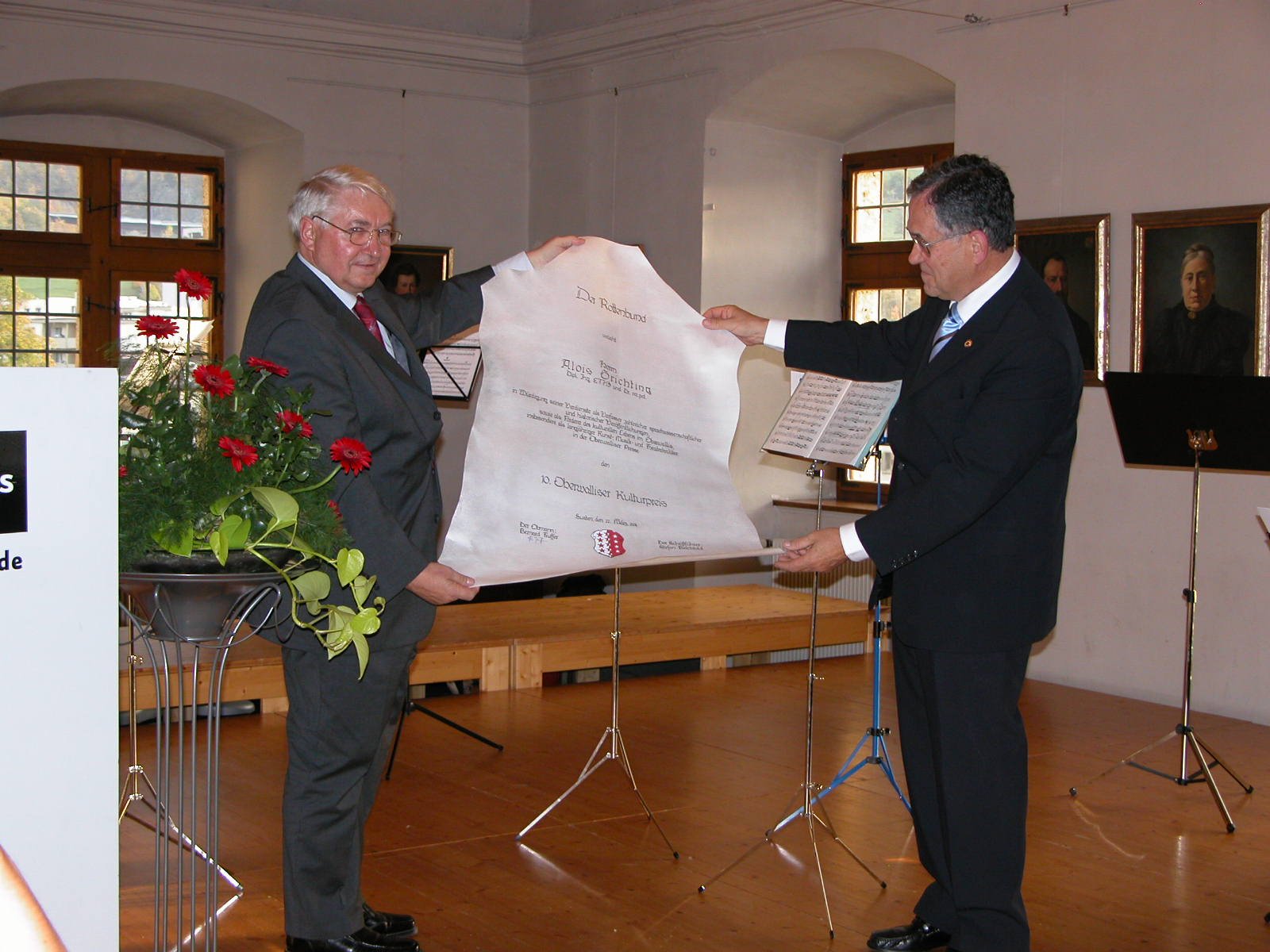 - Übergabe der 10. Kulturpreis-Urkunde v.l.: Obmann Dr. Bernard Truffer an Dr. Alois Grichting